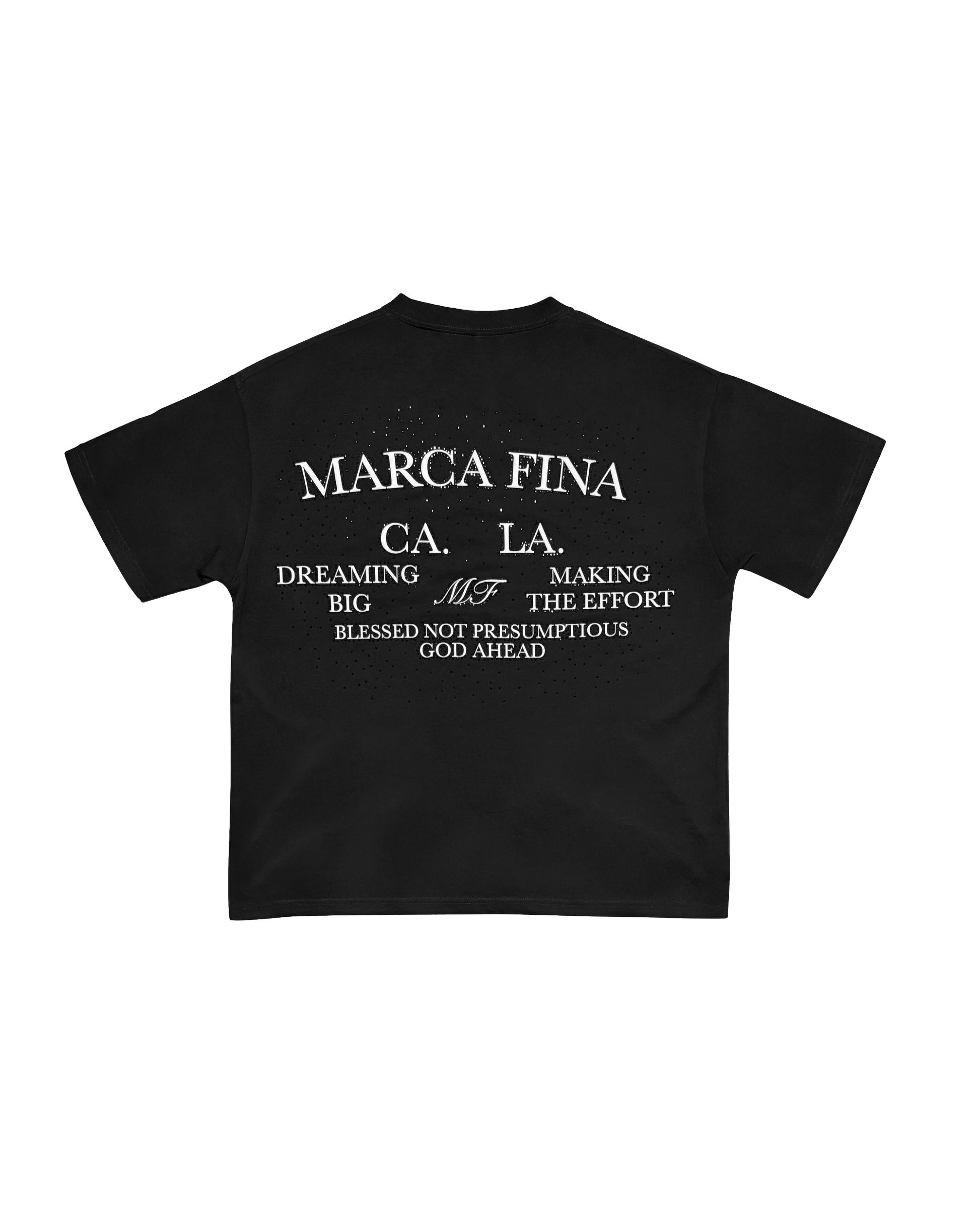 The God Ahead Tee represents faith, ambition, and humility through every detail. Crafted from premium heavyweight cotton, it features black rhinestones outlining each word, adding a subtle shine. The shirt has sayings like “Dreaming Big” , “Making the Effort,” , “Blessed Not Presumptuous. God Ahead.” Together, they serve as a reminder that every dream requires effort, every step should be guided by faith, and success shines brightest when rooted in purpose.
